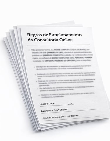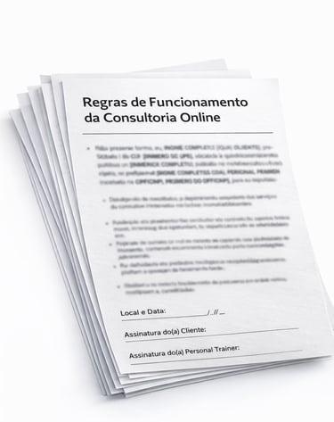 Documento editável que define horários, canais de contato, entregas e limites da consultoria online, alinhando expectativas desde o início.
